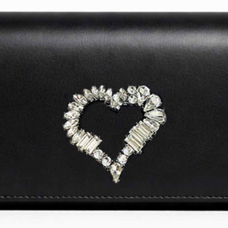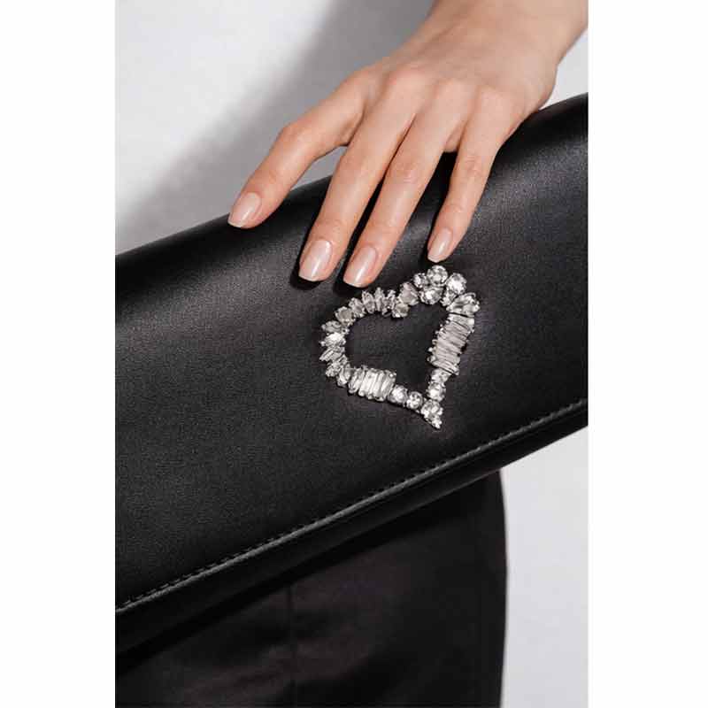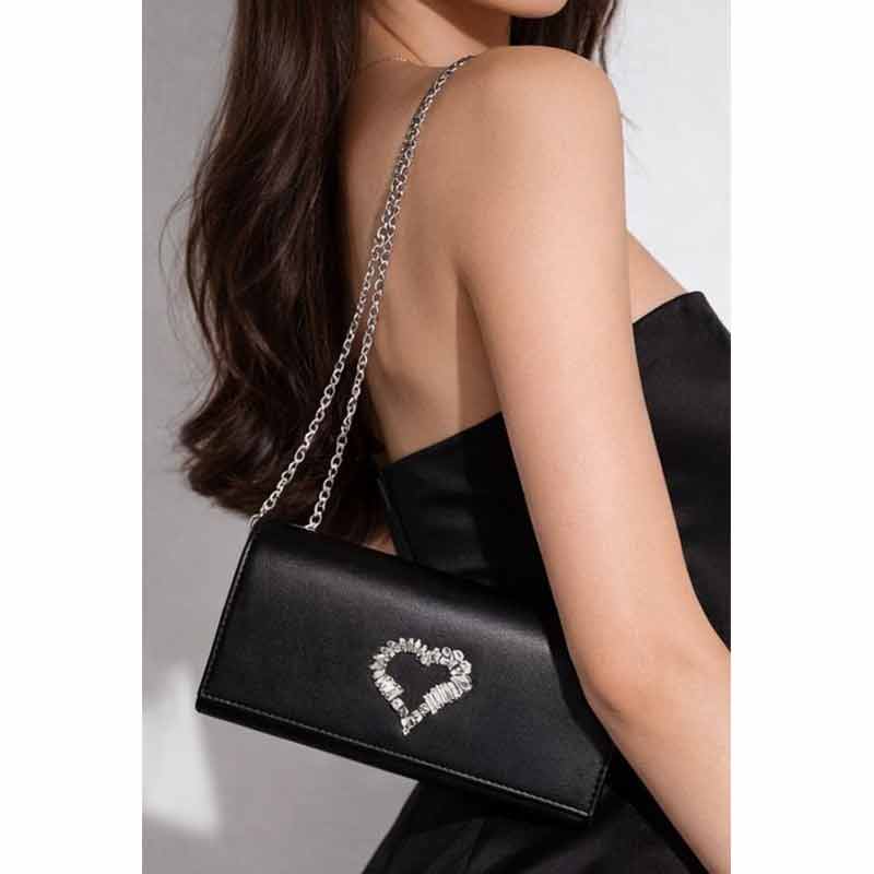 Clutch in pelle nera da donna con elegante dettaglio cuore gioiello e tracolla a catena. Perfetta per cerimonie, eventi e look da sera, unisce design minimal e stile sofisticato.