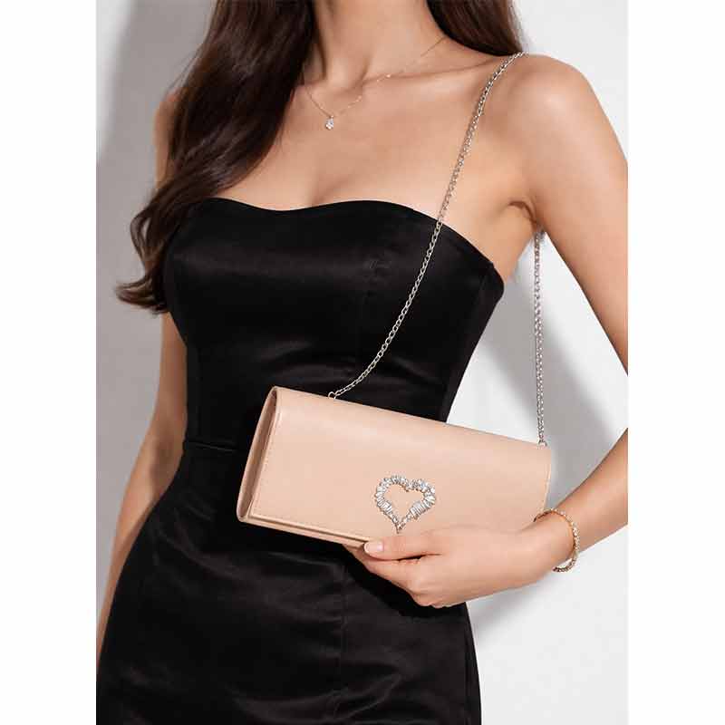 Clutch in pelle nude da donna con elegante dettaglio cuore gioiello e tracolla a catena. Perfetta per cerimonie, eventi e look da sera, unisce design minimal e stile sofisticato.