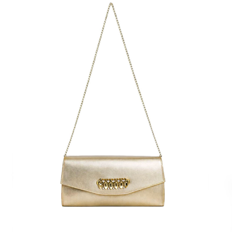 Clutch raffinata in pelle dal design minimal ed elegante. Dotata di sottile tracolla a catena dorata, è perfetta per occasioni speciali, cerimonie ed eventi serali. Capiente e versatile, può essere indossata a spalla oppure portata come pochette per completare con stile qualsiasi outfit.