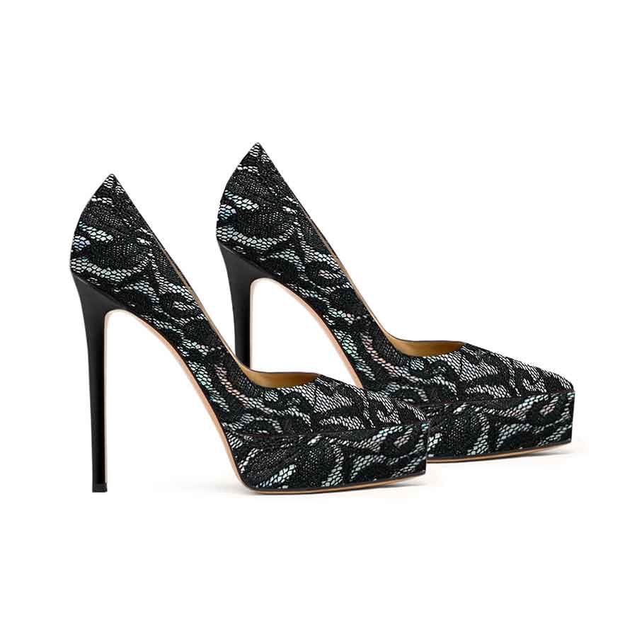 Comoda Décolleté con plateau in pizzo iridescente nero, tacco pelle nera.