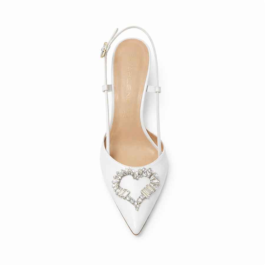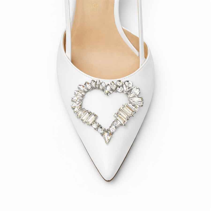 Décolleté slingback bianca in pelle con punta affusolata e tacco stiletto sottile, arricchita da elegante spilla gioiello a cuore. Disponibile in diverse altezze di tacco (8, 10 e 12 cm), è perfetta per look raffinati da sera o occasioni speciali, unendo comfort, femminilità e stile Made in Italy.
