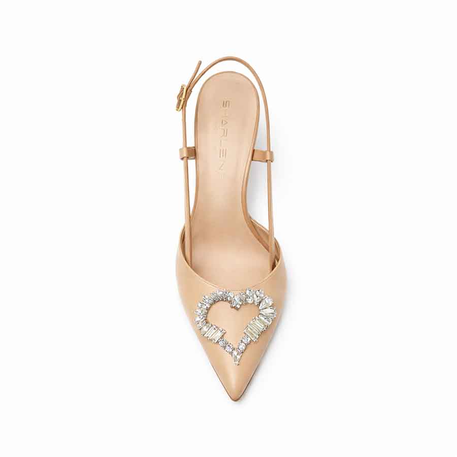 Décolleté slingback nude in pelle con punta affusolata e tacco stiletto sottile, arricchita da elegante spilla gioiello a cuore. Disponibile in diverse altezze di tacco (8, 10 e 12 cm), è perfetta per look raffinati da sera o occasioni speciali, unendo comfort, femminilità e stile Made in Italy.