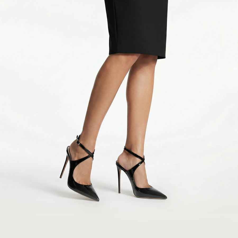 Décolleté a punta in vernice nera con tacco alto e cinturino alla caviglia: elegante, sensuale e perfetta per look sofisticati da sera o occasioni speciali.