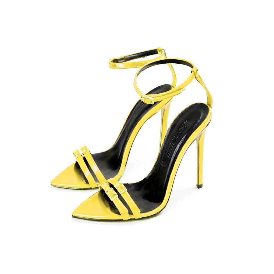Sandalo donna Sharlene in vernice gialla con tacco a spillo, design elegante con doppio cinturino frontale e fibbie dorate. Modello raffinato con cinturino alla caviglia e fodera nera, perfetto per look sensuali e occasioni speciali. Prodotto artigianale Made in Italy.