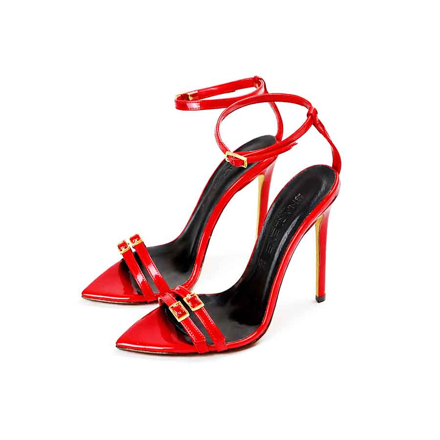Sandalo donna Sharlene in vernice rossa con tacco a spillo, design elegante con doppio cinturino frontale e fibbie dorate. Modello raffinato con cinturino alla caviglia e fodera nera, perfetto per look sensuali e occasioni speciali. Prodotto artigianale Made in Italy.