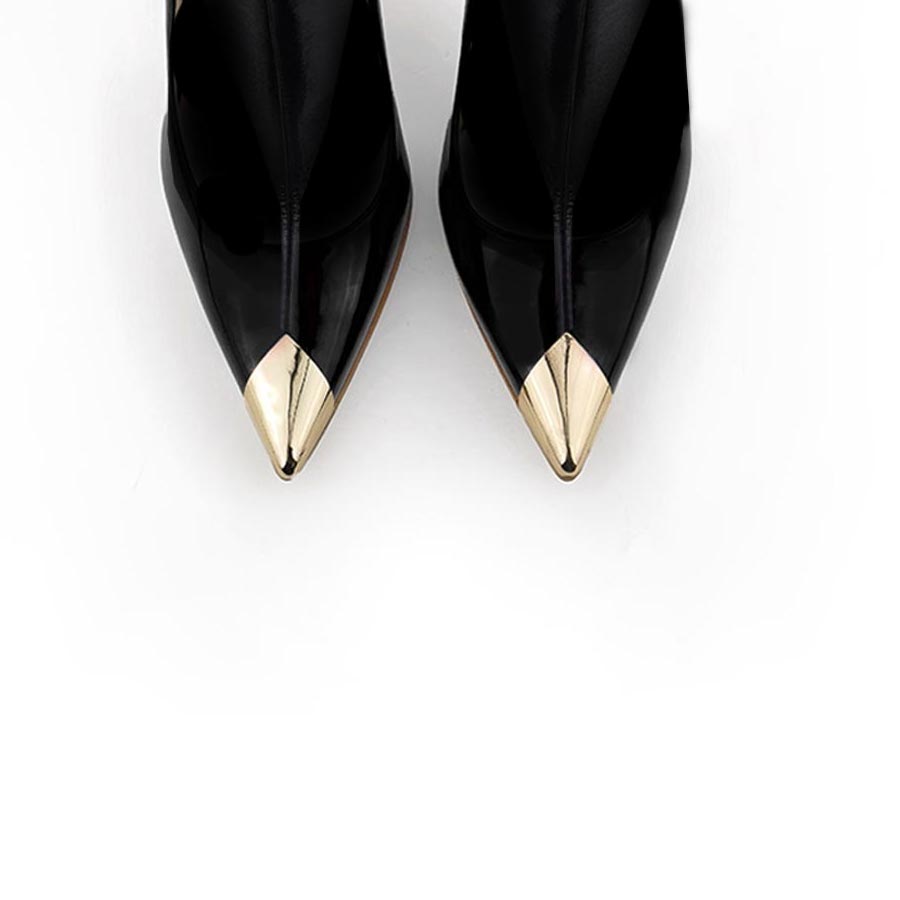 Stivale a punta in pelle nera elasticizzata, punta in metallo platino.