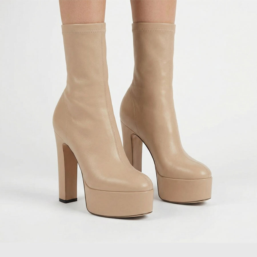 Stivaletto a punta tonda in pelle beige elasticizzata.
